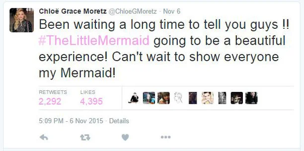 Over the weekend, the Amityville Horror star has taken to social media to reveal the news on her latest endeavor, posting an article from Variety Magazine—who first released the story on Friday, November 6th—on her Instagram account @chloegmoretz. Apparently, such news has been a much anticipated secret as Moretz tweeted on Saturday, “Been waiting a long time to tell you guys!! #TheLittleMermaid going to be a beautiful experience! Can’t wait to show everyone my mermaid!”