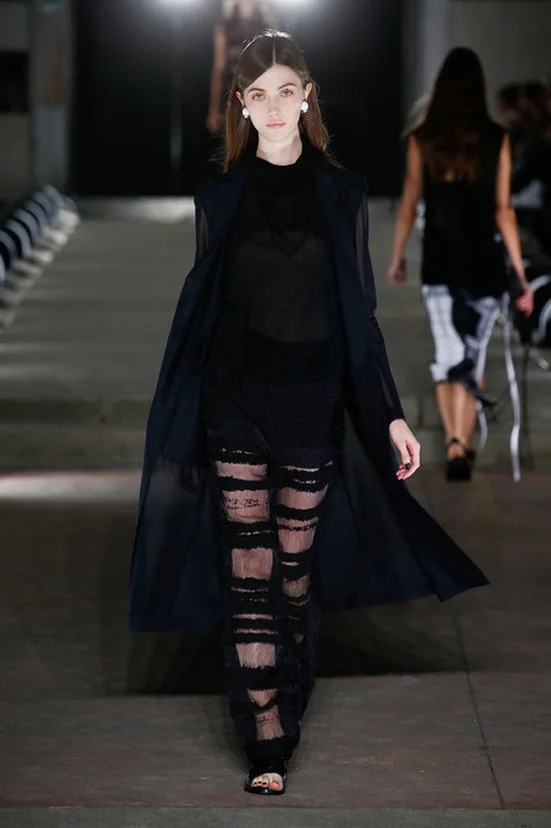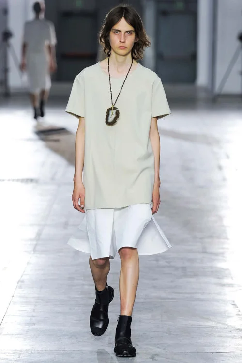 Damir Doma has shown his label’s 2016 spring/summer collection as a part of Milan Fashion Week. The line falls perfectly in line with the signature style that is a uniformity of simple, monochrome pieces and distinguished elongated shapes with flowing silhouettes. A variety of textures, dangling agate necklaces, and black strapped sandals completed each seamless look.