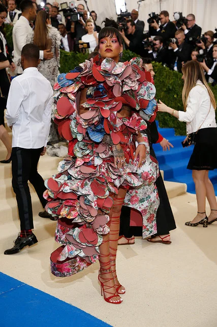 Rihanna, queen of streetwear fashion traded her Manolo boots for a Comme des Garçons dress with conical layers of floral elements.
