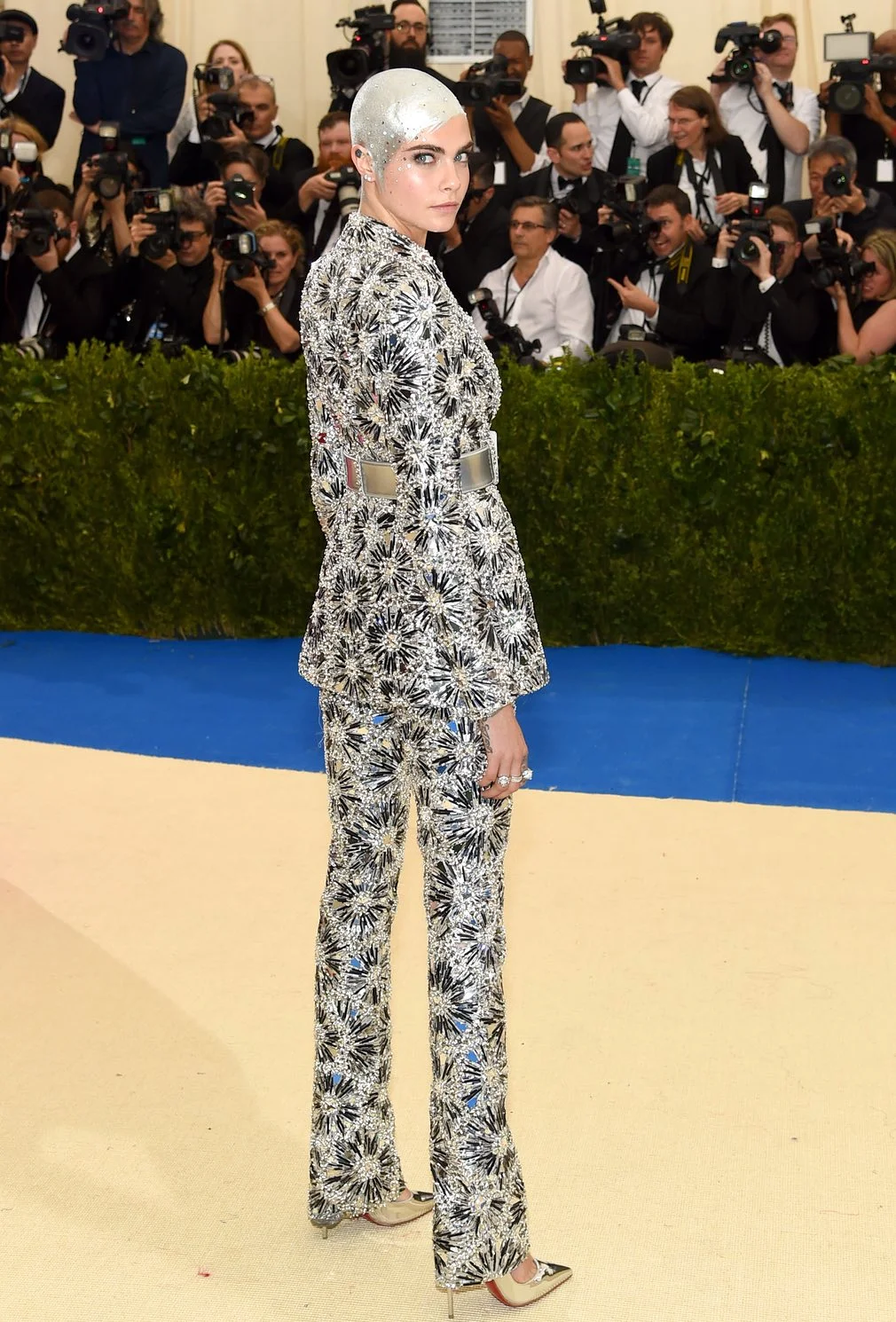 Cara Delevigne sizzled in silver in this statement belted two-piece from Chanel.