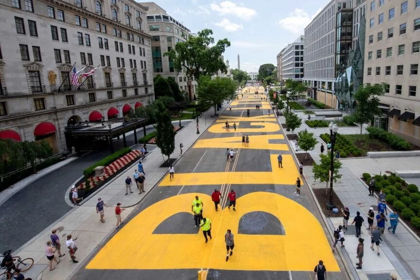 A view from above of a huge Black Lives Matter mural painted in bright yellow letters on a wide street